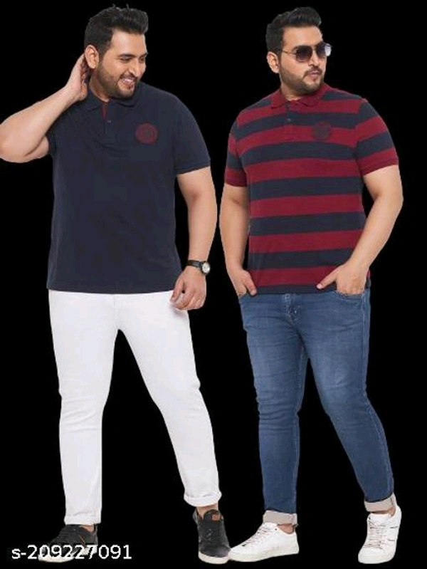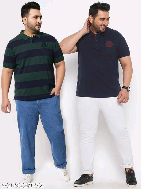 Austivo Men Striper/Solid Polo Neck T-ShirtName: Austivo Men Striper/Solid Polo Neck T-ShirtFabric: Cotton BlendSleeve Length: Short SleevesPattern: PrintedNet Quantity (N): 2Austivo Men Half Sleeve Striper Polo Neck T-ShirtSizes: XXXL (Chest Size: 48 in, Length Size: 30 in) 4XL (Chest Size: 52 in, Length Size: 31 in) 5XL (Chest Size: 54 in, Length Size: 32 in) 6XL (Chest Size: 56