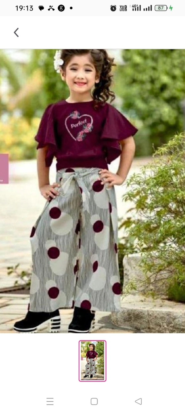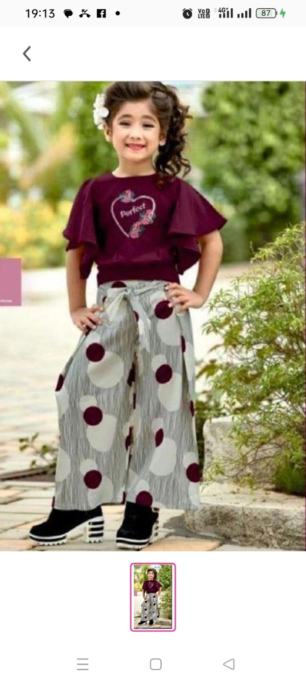 Baby girl's fancy top&plazzoTop Fabric: RayonBottom Fabric: RayonSleeve Length: Short SleevesTop Pattern: PrintedBottom Pattern: PrintedNet Quantity (N): SingleAdd-Ons: No Add OnsSizes:5-6 Years (Top Chest Size: 22 in, Bottom Waist Size: 17 in, Bottom Length Size: 21 in) 6-7 Years (Top Chest Size: 24 in, Bottom Waist Size: 18 in, Bottom Length Size