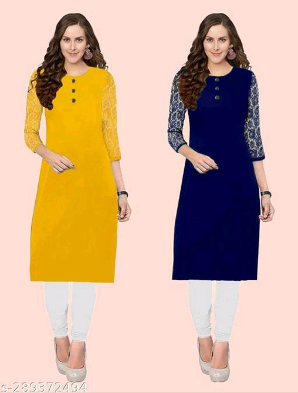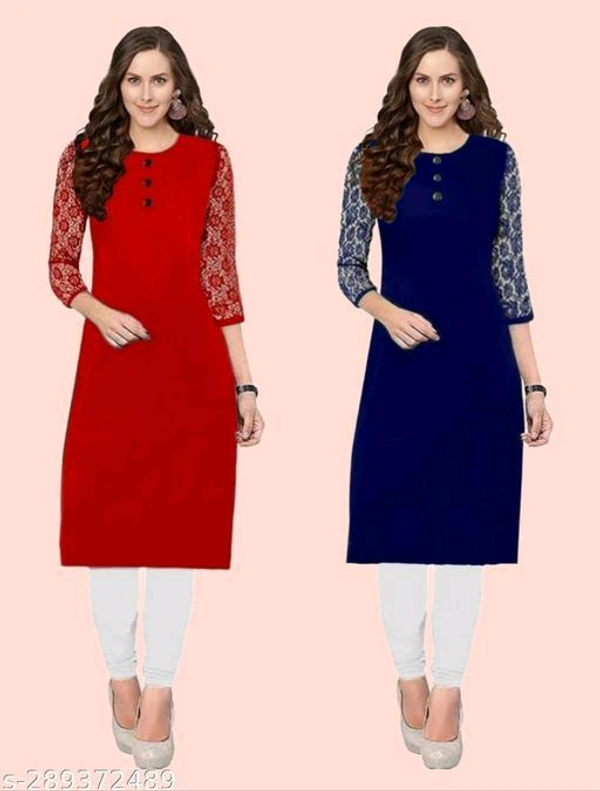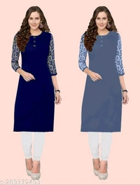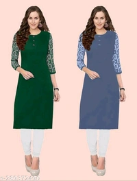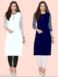 Petite Kurtis*Fabric: CrepeSleeve Length: Three-Quarter SleevesPattern: Embroidered,SolidCombo of: Combo of 2Sizes:XS (Bust Size: 35 in, Size Length: 40 in) S (Bust Size: 36 in, Size Length: 40 in) M (Bust Size: 38 in, Size Length: 40 in) L (Bust Size: 40 in, Size Length: 42 in) XL (Bust Size: 42 in, Size Length: 42 in) XXL (Bust Size: 44 in, Size Length: 42 in) XXXL (Bust Size: 46
