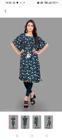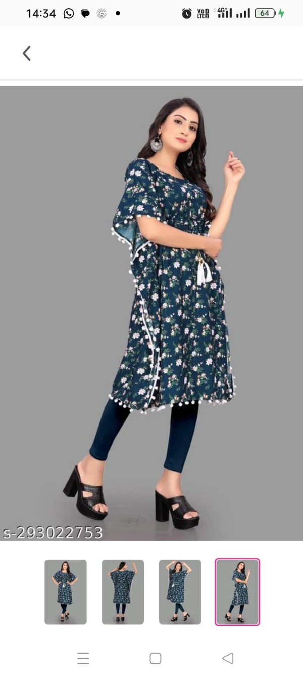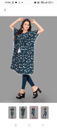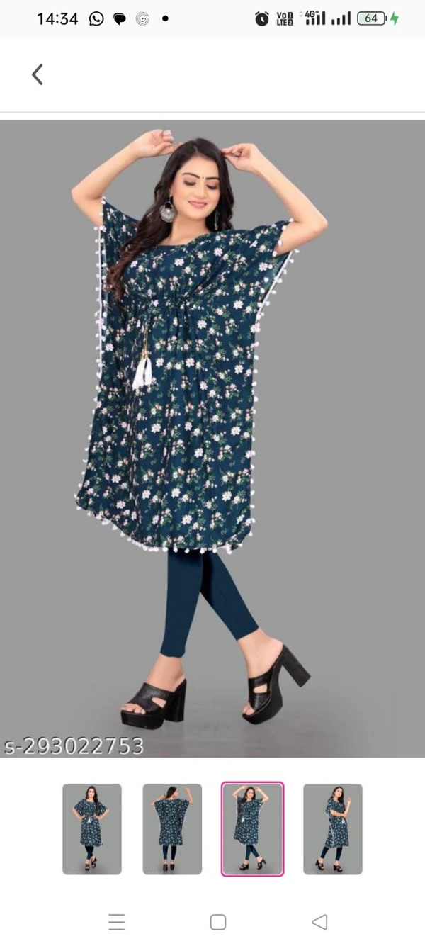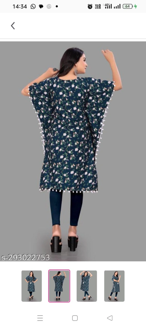 Stylish Crepe Printed women Kaftan TopName: Stylish Crepe Printed women Kaftan TopFabric: CrepeSleeve Length: Three-Quarter SleevesPattern: PrintedCombo of: SingleSizes: -S M L XL XXL XXXL (Bus