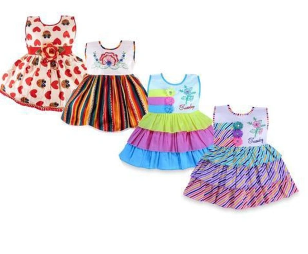 Trendy Wow Kids Baby Girls Cotton FrockFabric: CottonSleeve Length: SleevelessPattern: PrintedNet Quantity (N): Pack Of 4Sizes:0-6 Months (Bust Size: 10.5 in, Length Size: 15 in) 6-12 Months (Bust Size: 10.5 in, Length Size: 16 in) 12-18 Months (Bust Size: 10.5 in, Length Size: 17 in) 18-24 Months (Bust Size: 10.5 in, Length Size: 18 in) W